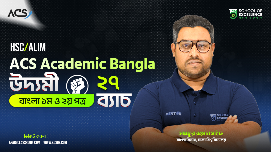 এইচএসসি/আলিম ’২৭ ব্যাচের উদ্যমী শিক্ষার্থীদের জন্য বাংলা ১ম ও ২য় পত্রের পূর্ণাঙ্গ প্রস্তুতির জন্য সাজানো হয়েছে ‘একাডেমিক উদ্যমী ’২৭ ব্যাচ’-এর কোর্স। বিশেষ করে বিজ্ঞান এবং অন্যান্য বিভাগের যে সকল শিক্ষার্থী অন্যান্য সাবজেক্টের পড়ালেখার ব্যস্ততায় বাংলায় সময় দিতে পারে না তাদের জন্য শুধু ক্লাসের মাধ্যমে সিলেবাস শেষ করানো হবে এই কোর্সে। যেখানে বাংলা ১ম পত্রের প্রত্যেকটা বাক্য ধরে ধরে এবং ২য় পত্রের ব্যাকরণের সকল বিষয় সহজভাবে বোঝানো হবে। টপিক ভিত্তিক MCQ এবং লিখিত পরীক্ষার মাধ্যমে বেসিক থেকে সবকিছু পড়ানো হবে যাতে দুর্বল শিক্ষার্থীরাও সব টপিক ঠিকমতো বুঝতে পারে। এছাড়া শিক্ষার্থীকে একাডেমিক থেকে এডমিশনের জন্য প্রস্তুত করে তোলা হবে।